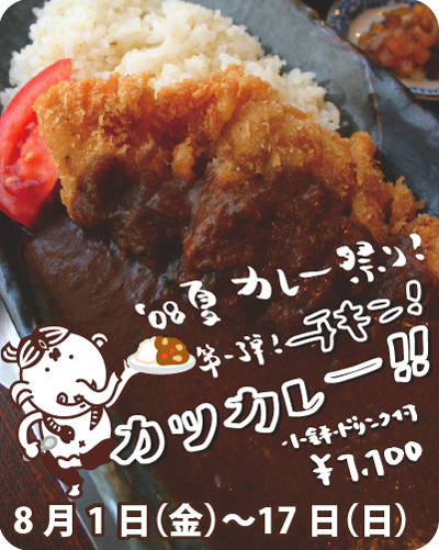 さてさて、そんな8月ですが、当店ランチタイムは’08夏・カレー祭!ということで、えぇ、第一弾は冬に週末のみ限定でお出ししておりました「チキンカツカレー」、えぇ、大好評でありましたこのメニュー、今度は平日のお客さんにもお召し上がりいただけますよ!ということで、本日からお盆明けの17日までお出しいたします!
