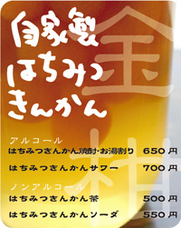 はちみつきんかんの....焼酎お湯割りであったまるのもヨシ、サワーでさわやかにいくもヨシ、お酒が苦手な方には、はちみつきんかん茶や、ソーダ割りもイイネ!