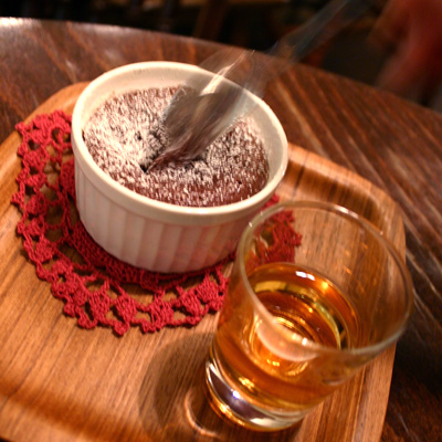 今年は....ご一緒にウイスキーなどいかがでしょうか?チョコレートとウイスキー、こうゆうのを「モルト&ショコラ」って言うそうなんですが.....えぇ、件の渋いダンディな男性のお客さんがカッコよくご注文されたのを見て、あぁ、来年は是非これで行ってみたいなと思いました.....えー、女性のみなさんは意中の男性に、最後にこの「モルト&ショコラ」をご注文.....えぇ、色香がありますよね.....この組み合わせ......イイネ!