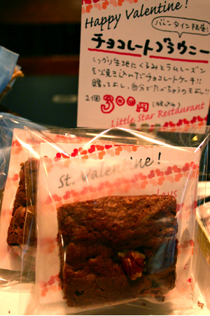 今年はもうひとつ、フカザワががんばってくれまして....お持ち帰り専用の「チョコレートブラウニー」もご用意いたしました。くるみとレーズンを焼き込んださっくりこんがり、ライトな食感のチョコレートケーキ、すでに先日からお出ししておりますが、なかなかの人気であります.....ご希望のお客さんにはちょっとしたラッピングもいたしますので、是非お申し付け下さいね。