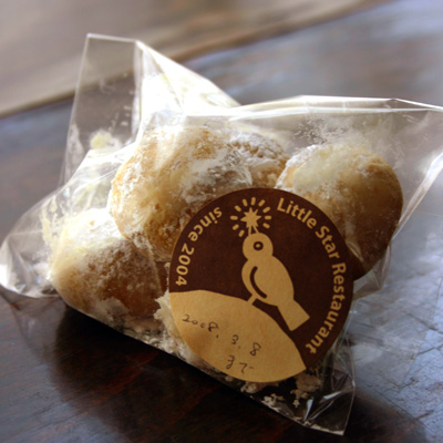 粉砂糖をまぶしたコロコロかわいいサイズのまあるいクッキー!さくさくとした食感、お口の中いっぱいにアーモンドの風味がふんわり広がりますよ.....って、これね、コーヒーとか濃いめの紅茶なんかのお茶請けにホントにうってつけです!....甘い物があまり得意でないワタクシだって、ついついもう1個.....ってかんじで、ついついつまみたくなる一品!
