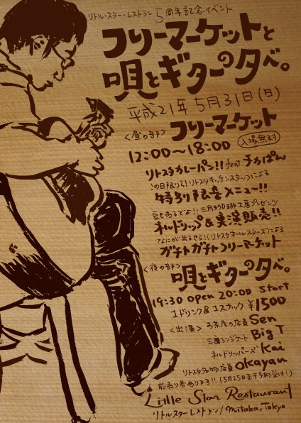 えっと、本日開催!当店5周年記念イベント「フリーマーケットと唄とギターの夕べ。」