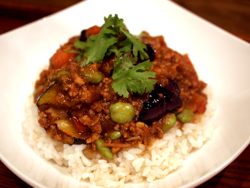 ラムの挽肉の独特の風味を効かせたスパイシーで、旨味たっぷりのキーマカレー!.....具は旬の夏野菜....茄子にトマトに緑の彩りを添えるのは枝豆!味的にも食感的にもこの枝豆がちょっとしたアクセントになってますね、えぇ。