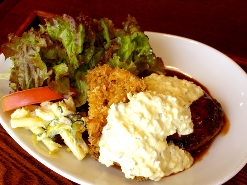 そしてハンバーグ特別メニューは.....あー、何度か「ウラ★スタ」にも上げた単なる高カロリー賄いメニュー(苦笑).....でも挙げ句の果てに.....某コンビニのお弁当開発担当の方から、どうにかたべられないものかとお問い合わせのお電話をいただいた、伝説のあのメニュー(んなわけない)!「ハンバーグときのこフライ・タルタルソース定食」。
