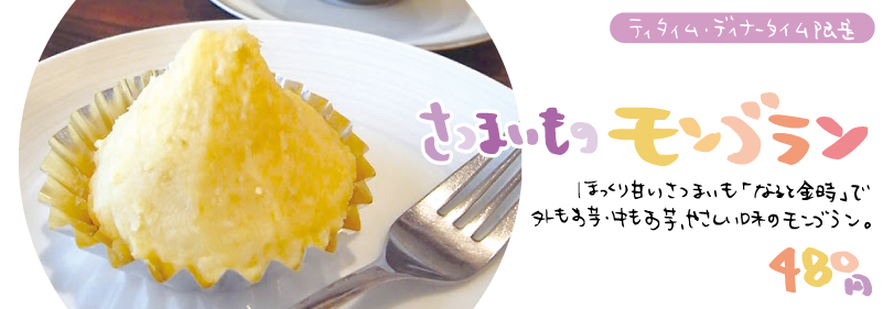 ということで、ティタイム・ディナータイム限定!旬のデザート「さつまいものモンブラン」、ほっこりしたおいしさ、是非お見逃しなく!