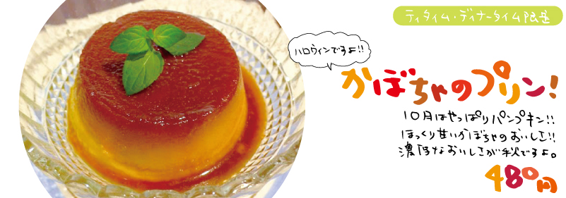 あぁ、先週あたりからすでにすっかりお出ししておりますのに、告知が遅くなりまして申し訳ありません、えぇ、なんといっても10月はやっぱりパンプキン!月末のハロウィンに向けて、今年もとっておきのかぼちゃのデザート、えぇ、今年はプリン!こいけ菓子店謹製「かぼちゃのプリン」ですよ!