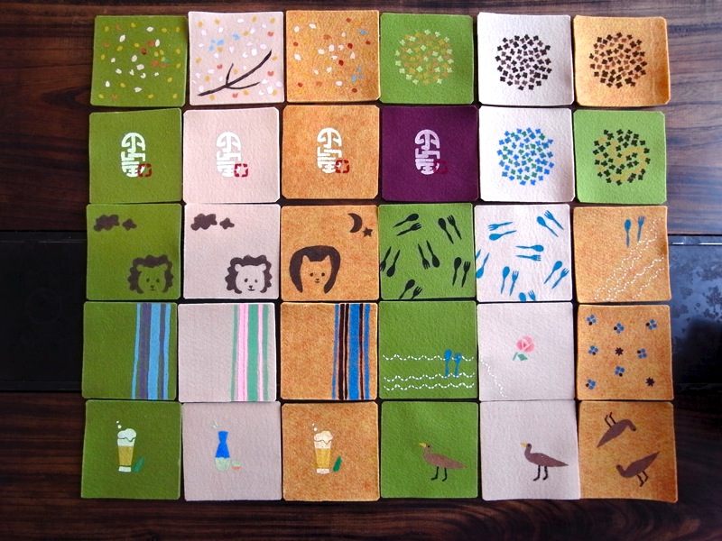 今回用意されたコースター用のフェルト.....春らしく(?)黄色に黄緑、そしてベージュと.....まずはその下地も含めて、色鉛筆で再現しながら柄や配置を考え中の店長ミヤザキ。