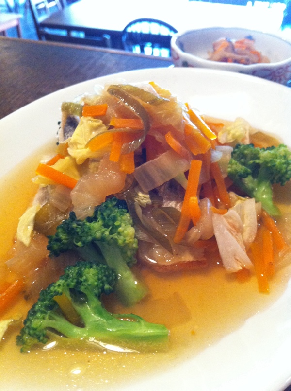 クセのない白身魚、さわらをからりと揚げたら....にんじんにブロッコリ、白菜等々の野菜の旨味がたっぷりのやさしい味のあんをとろりとかけていただきます。旨味がさわらにしっとり絡んで、これがホントおいしいわけよ!(笑)