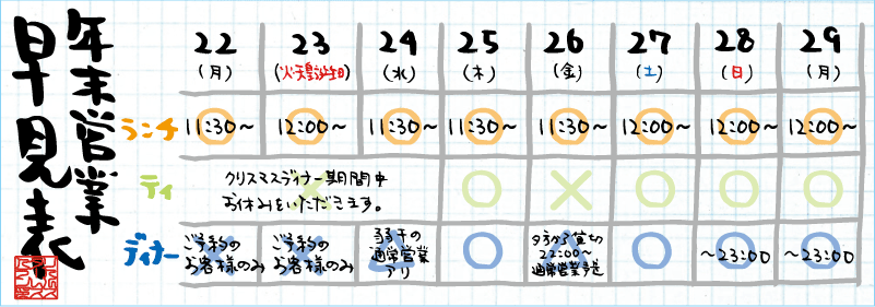 それから当店今年最後の営業日の29日(月)は日曜日に準ずるタイムテーブルでの営業とさせていただきます、えぇ、カンタンに言うとディナータイムは1時間仕舞いですよと(笑)、22:00ラストオーダー、23:00閉店となります、えぇ、よろしくお願いします。