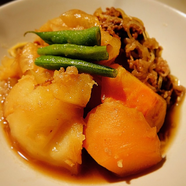じゃがいもに牛肉、にんじん、たまねぎ、シラタキにインゲンで色を添えた、ものすごくオーソドックスな肉じゃが....だけどやっぱり、だからこそほっとしますねよ、このお味。揚げものみたいに派手じゃないけど、これぞ日本のオフクロの味!肉じゃが!