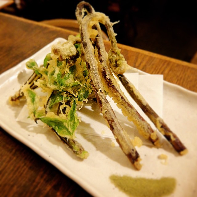 GWはおなじみのお客さんのご旅行土産!春の山菜はわらびとこしあぶらをシンプルに天ぷらに!揚げたてあつあつを抹茶塩でどうぞ!