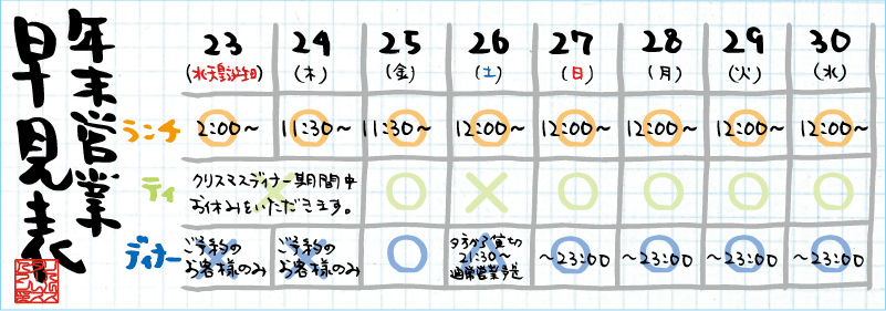 あー、年末はぶっ続け営業は通称「死のロード」。今年は連続9日間と去年の14日連続に比べたら大したことはないとはいいつつ、えぇ、それでも総力戦の消耗戦(苦笑)、クリスマスディナー期間もあって、すでにすっかり曜日感覚もなくなりつつある...とにかく来る日来る日をひたすらがんばるモードになっております今日この頃(苦笑)、いや、ここでひとまず年末最終日までの当店の営業をお知らせしておきますね!