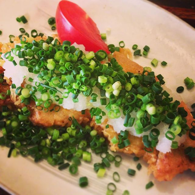 ま、もう説明いらずのおなじみメニュー!うすくコロモをつけてからりと揚げた豚の天ぷらあつあつに、たっぷりの大根おろしと万能ネギをのせて、さっぱりぽん酢でいただきます!...って、それだけですけど、コレがうまい!(笑)揚げものだけれど大根おろしとぽん酢なので、全然重くないですよ!
