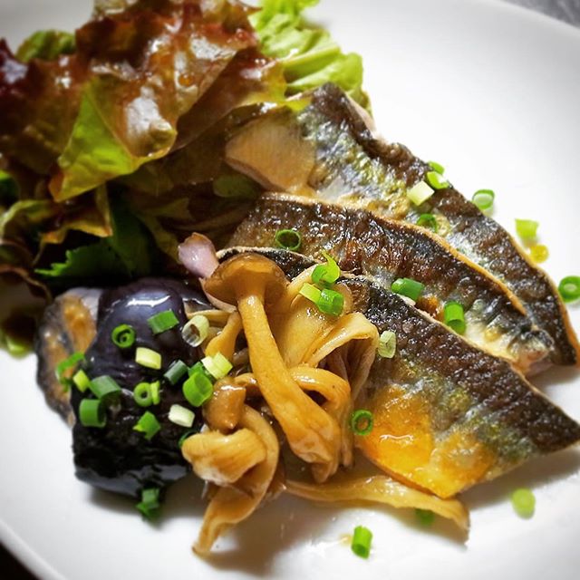 塩こしょうで下味をつけて粉をはたいてさっとソテーしたぴちぴちのさんま、あつあつに、さっぱり茄子ときのこのマリネを添えていただきますよ....って、脂ののったさんまのソテーにさっぱり白ワインビネガー仕立ての旨口茄子ときのこのマリネ....これがあわせてみるとベストマッチ!