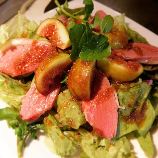 皮ごとざっくり切ったいちじくのやさしいおいしさと独特な食感!....そこにあわせるのが当店御用達のお肉屋さん、武蔵境はマイスター村上さんの合鴨スモーク!.....その風味とやわらかい旨味.....そしてさっぱりあわせる葉物野菜はクレソンにパプリカ、そしてサニーレタス.....と、そこをとりまとめるのが、また独特の風味のバルサミコドレッシング!