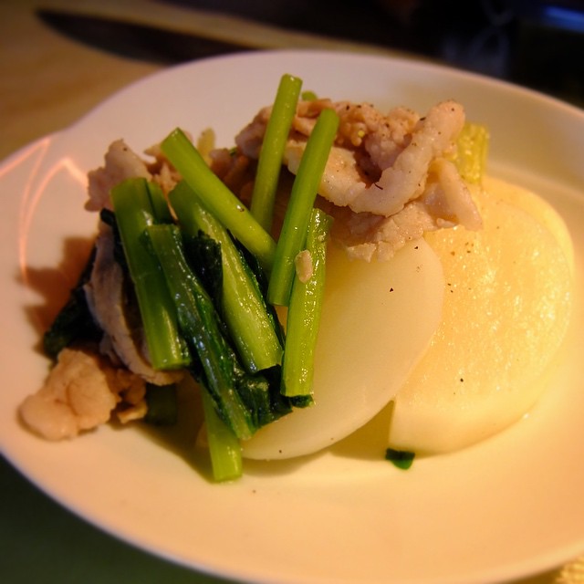 形のいいかぶをきゅきゅっと冷水で洗ったら、旨味たっぷりの豚バラ肉といっしょに、あっさりだし汁で蒸し煮にしますよ。さっきたべたんですけど、黒こしょうがピリリと効いて、和風...ではあるんですけど、さっぱり洋風とも言えなくもない....とにかく、かぶに旨味がしっかりしみてて、うまうま。