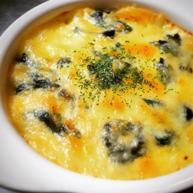 ぷりぷりエビに旬のほうれんそうは栄養満点!当店おなじみツウィストのマカロニにやさしいお味はまろやかな手作りホワイトソース!...あぁ、グラタンって、ホントにすてき(笑)。あつあつ焼き上げた仕上げに、秘密兵器のガスバーナーでこんがり焦げ目、風味づけ!