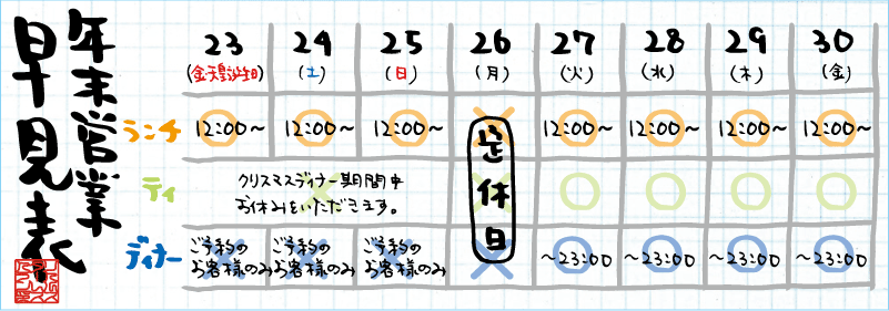 あー、今年の忘年会のピークだったそうですなと花金ならぬ花木の夜営業も終わって仕事上がり...あー、明日から当店亜クリスマスディナーからの年末営業となるわけですが、これから年末30日までの当店営業状況をお知らせいたしますと、まずはトップイメージにも貼り付けてありますけど、えぇ、毎年恒例のこの早見表をまるっとご覧くださいな。