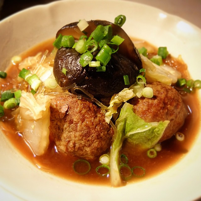 しいたけのだしとオイスターソースで、コトコト煮込んだ肉だんごに、そろそろ旬ですね....白菜とヘルシーな春雨。いっしょに煮込んで、その旨味をしっかりしみ込ませた、あぁ、めちゃうまのオイスター煮込み。ごはんにもうってつけであります。