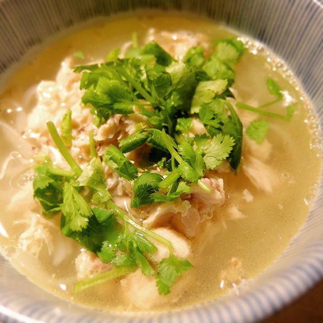 おなじみベトナム風ゆで鶏にパクチー、香味野菜なんかををざくざく細切りにしたら、あつあつのベトナム風スープとやさしい味の米麺.....そこにえいやとのっけ盛り!お好みでレモンを搾ってお召し上がりです!