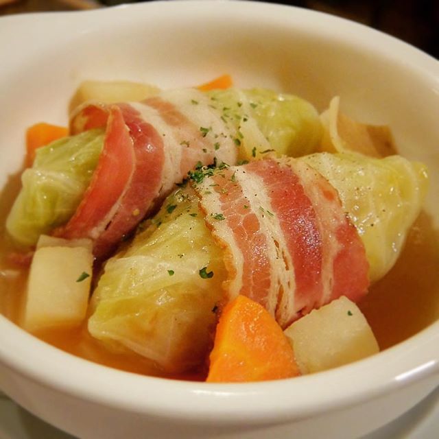 肉だんごのしかりした旨味をやわらかなキャベツの食感と優しい甘みが包み込んで、えぇ、ベーコンをきゅっと巻き付けた......シンプルなコンソメ味のミヤザキ家風ロールキャベツ!いや、店長ミヤザキが中学生くらいの時は3つくらいぺろりとたいらげたと書いておりますが、えぇ、ワタクシもホント好きだったなー、ロールキャベツ。