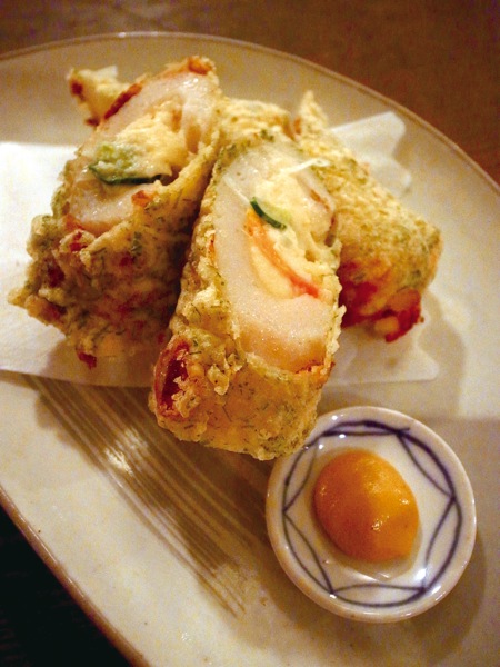 穴があったら入りたい......辛子蓮根の例を挙げるまでもなく、熊本では穴があったらなにか詰めてしまうわけでございますよ(いや確かではございませんが).....ということで、ちくわの穴.....ポテトサラダを詰めてしまえ!と、当店自慢のポテトサラダ、定番中の定番メニューをぐいっと詰めてしまいましたら、コロモをつけて、からり揚げたて!あつあつのポテサラちくわ天!
