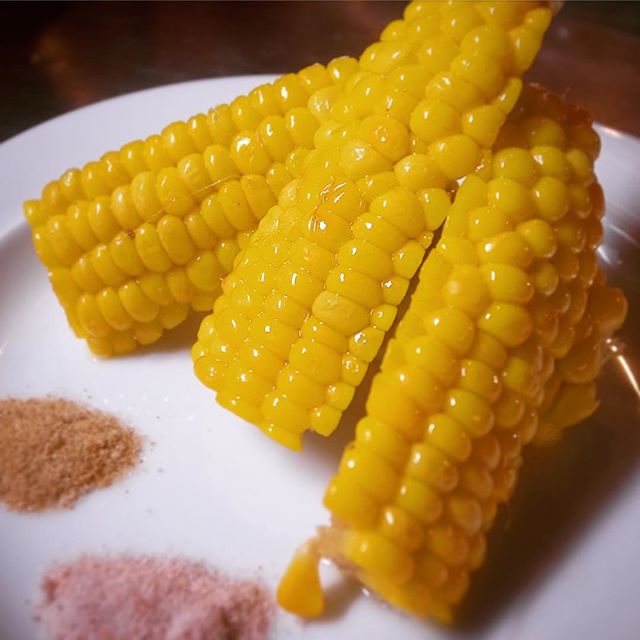 もちろん揚げたてあつあつ、そのままでもおいしいんですけど、お好みでカレー塩と山椒塩.....また味を変えつつ旬のとうもろこしをしっかり味わっていただきたいと申しますか、えぇ、かぶりついていただきたいと、そのような所存でございます。