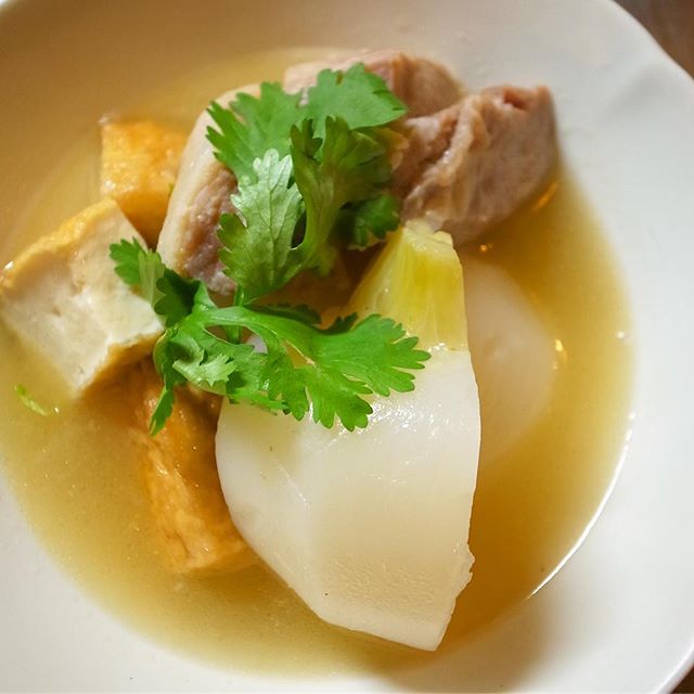 塩をもみ込んで熟成させた塩豚の旨味と、ざっくり厚揚げのボリューム感、寒さで甘く引き締まったかぶ.....これがみずみずしくとろりと煮込みました。ナムプラーをアクセントに、ちょっとアジア・ベトナム風もイイネ。とあったかくて、おいしくて、ほっとするね。