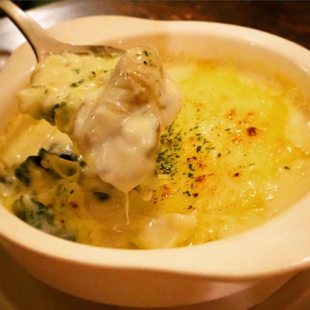 ということで、冬のおいしさ!海の王様は旨味いっぱい.....滋養満点の牡蠣!そのおともは、この時期こちらも旨味を増しますね、独特の風味とこちらも栄養満点緑黄色野菜のほうれんそう!!えぇ、冬の栄養満点なコンビで、もちろんまろやかでやさしいお味の手作りクリームソース、あつあつグラタン!冬のイチオシグラタンですよ!