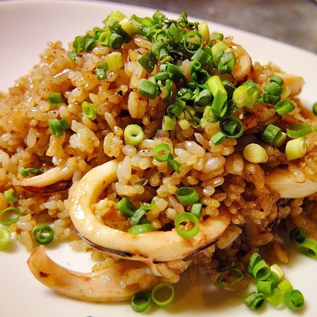 ピカピカ新鮮なスルメイカ....をざくざく....キモも墨も一緒にざくざくとぶつ切りにしてざっくり炒めるわけでありますね......と、ここでバターで甘味とコクも加えて醤油でじゃじゃっとざっくり炒めます.....キモの旨味、ぷりぷりな食感....そこにすかさずざっくりごはんを投入して、