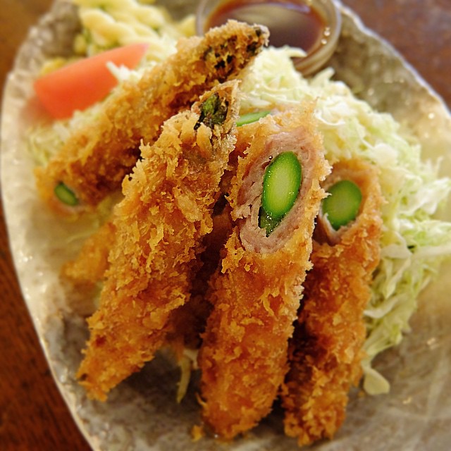 いや、まさに旬のアスパラ.....その甘くやわらかくそして生き生きぷりぷりとしたアスパラを、豚肉の旨味でぎゅっと巻いたら、コロモをつけてからりと揚げたて、あつあつのうちにソースをだぼだぼつけて、さくさく!