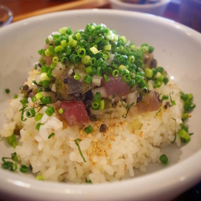 みんな大好き!しっかり旨味のまぐろに玉ねぎ、ピクルス、青じぞに黒オリーブ等々みじん切りにした薬味をあわせたらあつあつごはんにのっけ盛り!いや、これが丁度これからの季節にうってつけの薬味の効いたさわやかな洋風ごはん!
