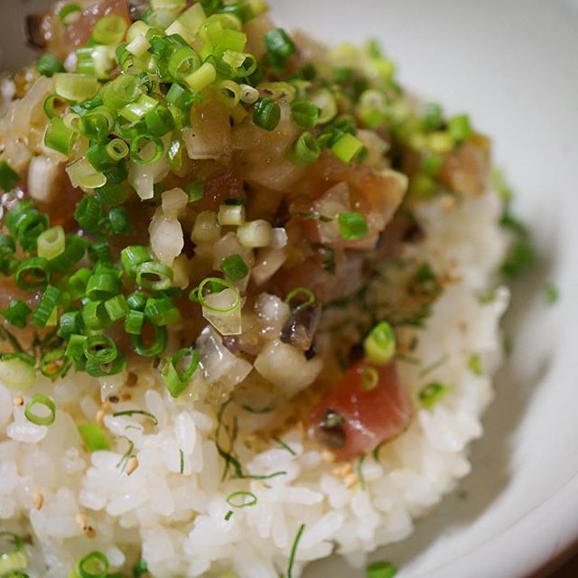 みんな大好き!しっかり旨味のまぐろに玉ねぎ、ピクルス、青じぞに黒オリーブ等々みじん切りにした薬味をあわせたらあつあつごはんにのっけ盛り!いや、これが丁度これからの季節にうってつけの薬味の効いたさわやかな洋風ごはん!