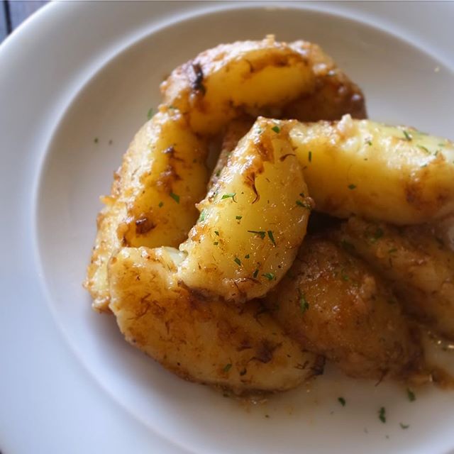 ほっくりふかしたほろ苦い旬の新じゃがに、、これまたほろ苦いふきみそはじりじり焼いたふきのとうと味噌を合わせた自家製!バターといっしょにじゃじゃっとソテーします!味噌の香りが飛ばないように、ささっとあえる程度にソテーするのがミソ。