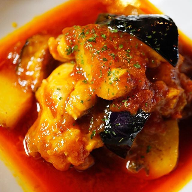 一度素揚げにしたほくほく新じゃがにしっかり鶏手羽元の旨味と出汁、トマトソースと相性のいい茄子をいっしょにコトコト煮込みました。さっぱりとした酸味と旨味のトマトソースまで余すところなくしっかりたべたいですね、ホント。ボリューム感もあるし、まさにごはんのおかずにうってつけ。