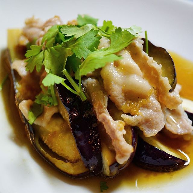 さくさく柵切りにした旬のぷりぷり茄子と旨味たっぷり豚バラ肉を合わせたら、じゃじゃっと中華鍋で酒蒸し!.....あつあつのところに当店お馴染み!ナンプラーベースの自家製のベトナムだれ!さらにパチーを散らして夏のエスニックな酒蒸し!