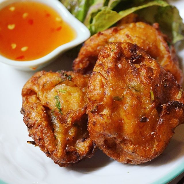ぷりぷりエビはざっくり刻んで下味つけて、はんぺんとねぎに生姜、さらにパクチーをあわせてだんごにしたら、揚げたてあつあつタイ風さつま揚げ!もちろんスウィートチリソースで!