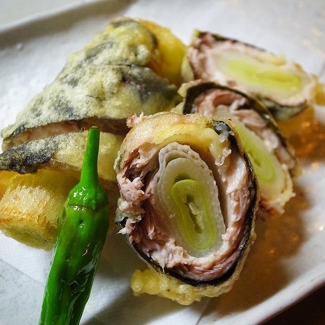 脂ののった旬のうまいさんま、長葱にくるんと巻きつけたら....このねじりながら巻きつけるかんじが.....たづな(手綱)なんでしょうね....からりとシンプルに天ぷらにしてしまいます....長葱の風味がさんまをさっぱりさらにおいしくさせるのでありますね....抹茶塩と天つゆでお召しかがりいただきますよ。 いや、長葱がさんまの臭みを程よく抑え、さらに甘さとさっぱり感を加え多ところに、香ばしい海苔の風味がまた味に厚みをもたせます.....こんなたべ方あったのね!と、ちょっと目からウロコモノ、毎年人気なのであります。