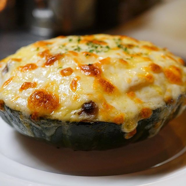 去年は「坊ちゃんかぼちゃ」でお出ししたかぼちゃをまんま使ったグラタン!今年はすっかりおなじみ高知直送は森田農園さんの「栗味かぼちゃ」!坊ちゃんかぼちゃと同じくミニかぼちゃのようですよ!