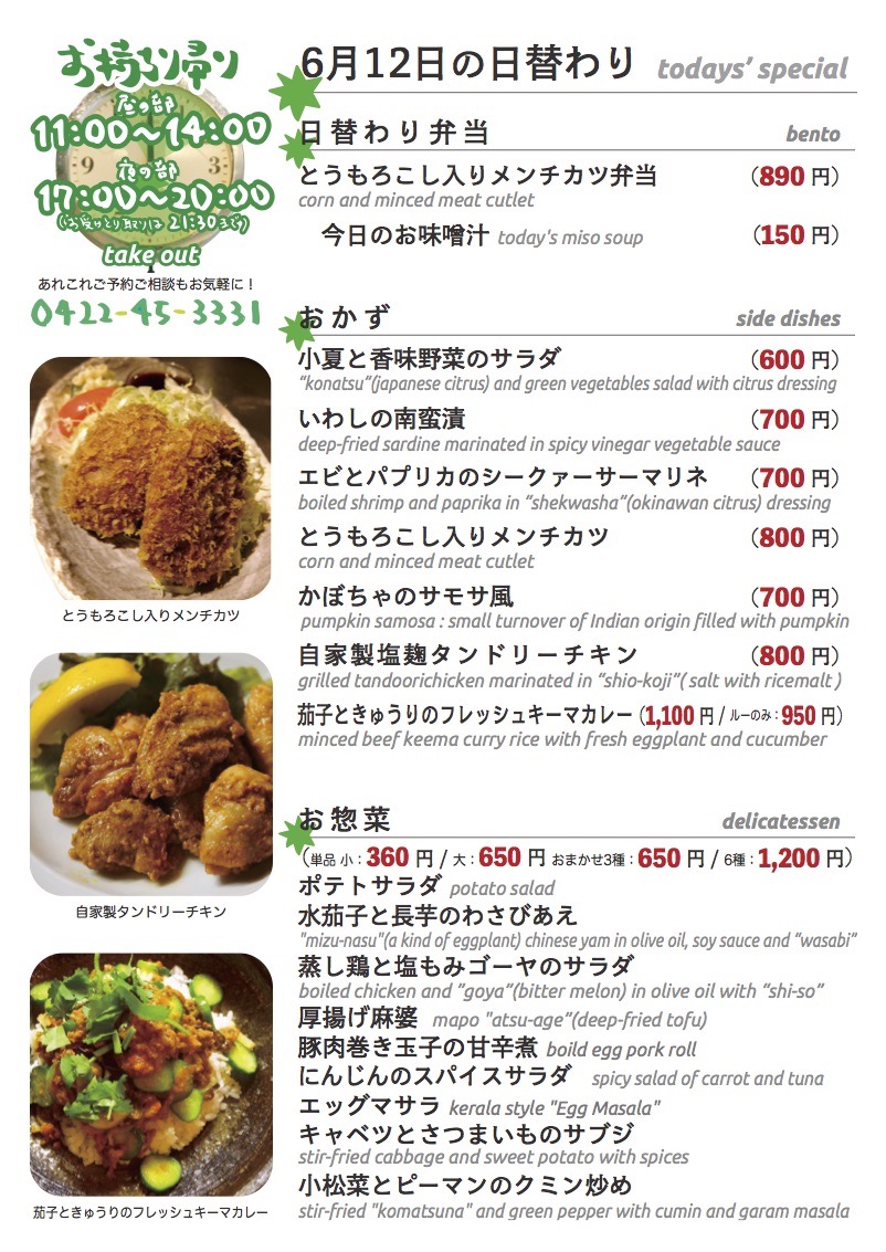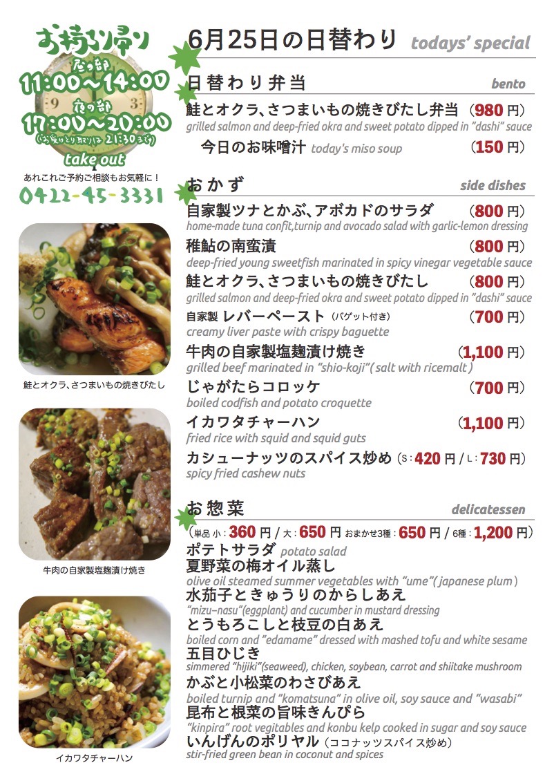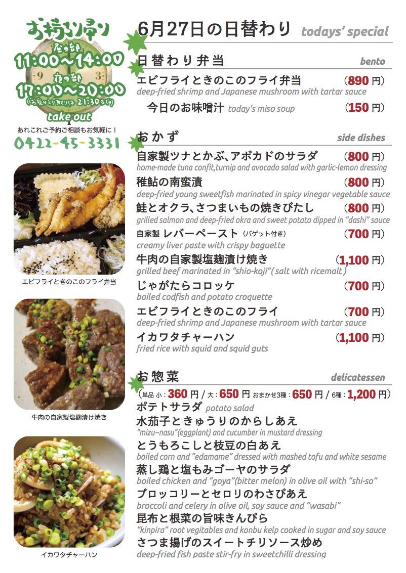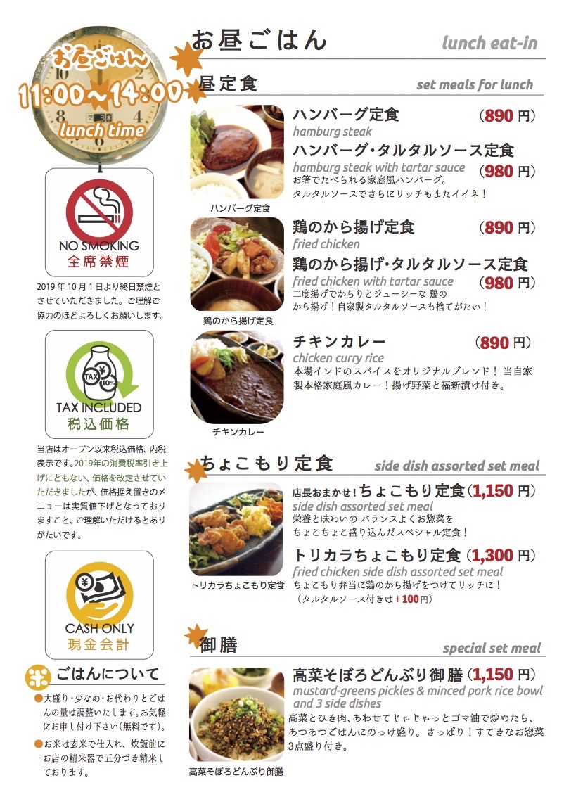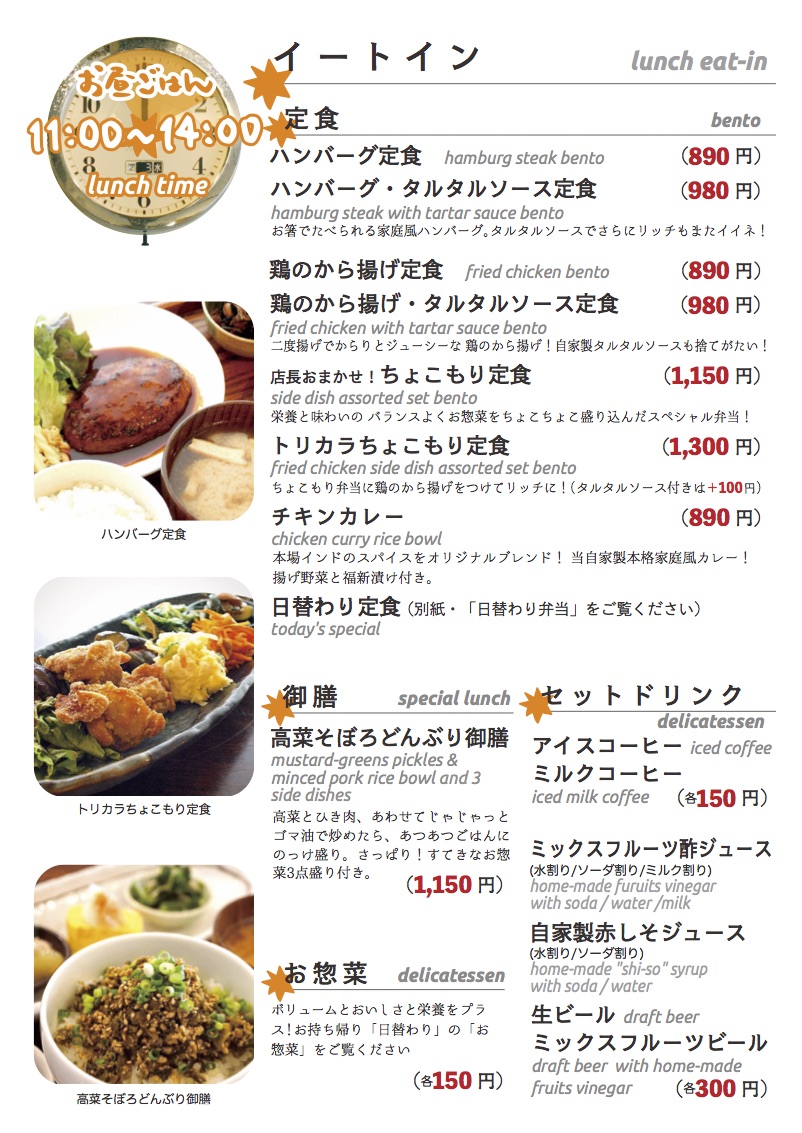 メニューはこちらをクリックしていただければご覧いただけますが...ひとまずはお昼の部のみ、お弁当がそのまま以前のように定食でお召し上がりってなところからスタートとさせていただきます。