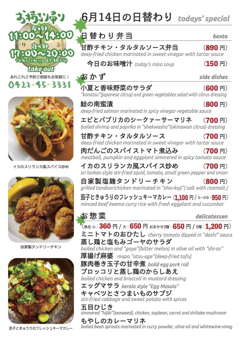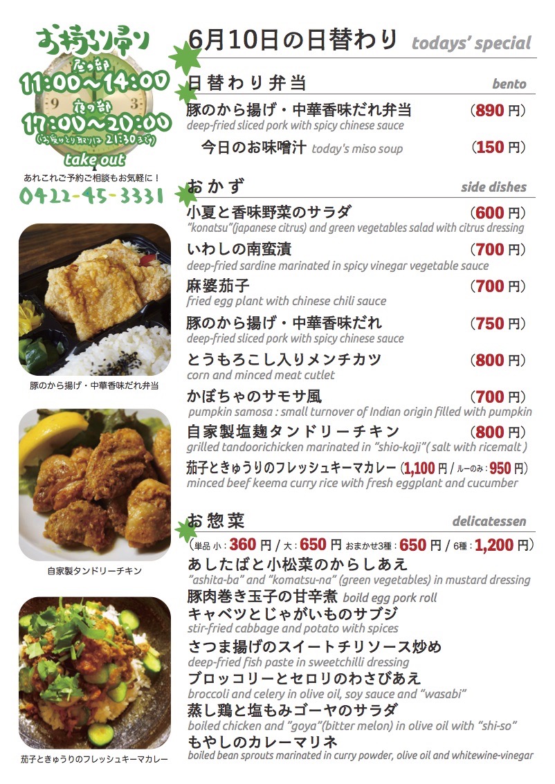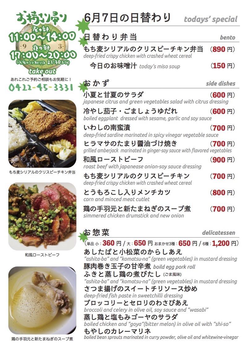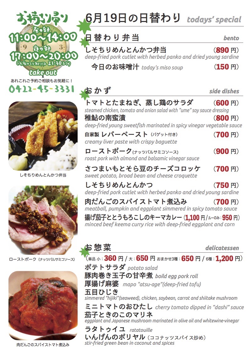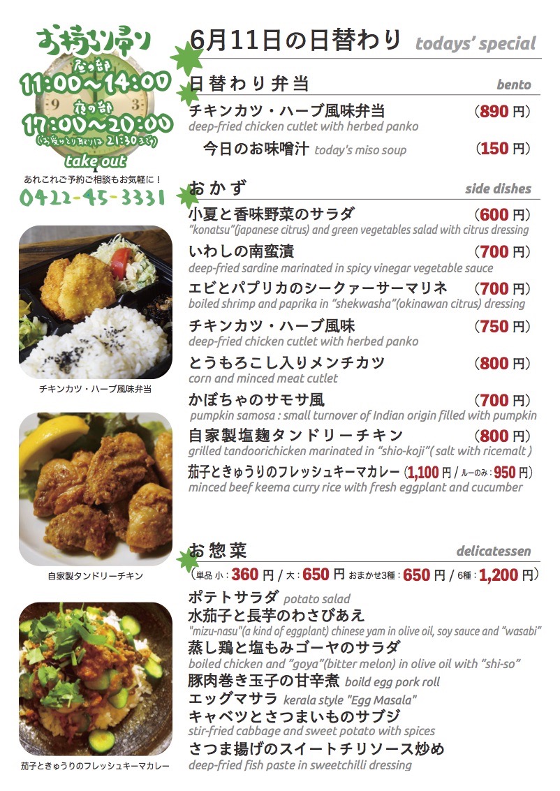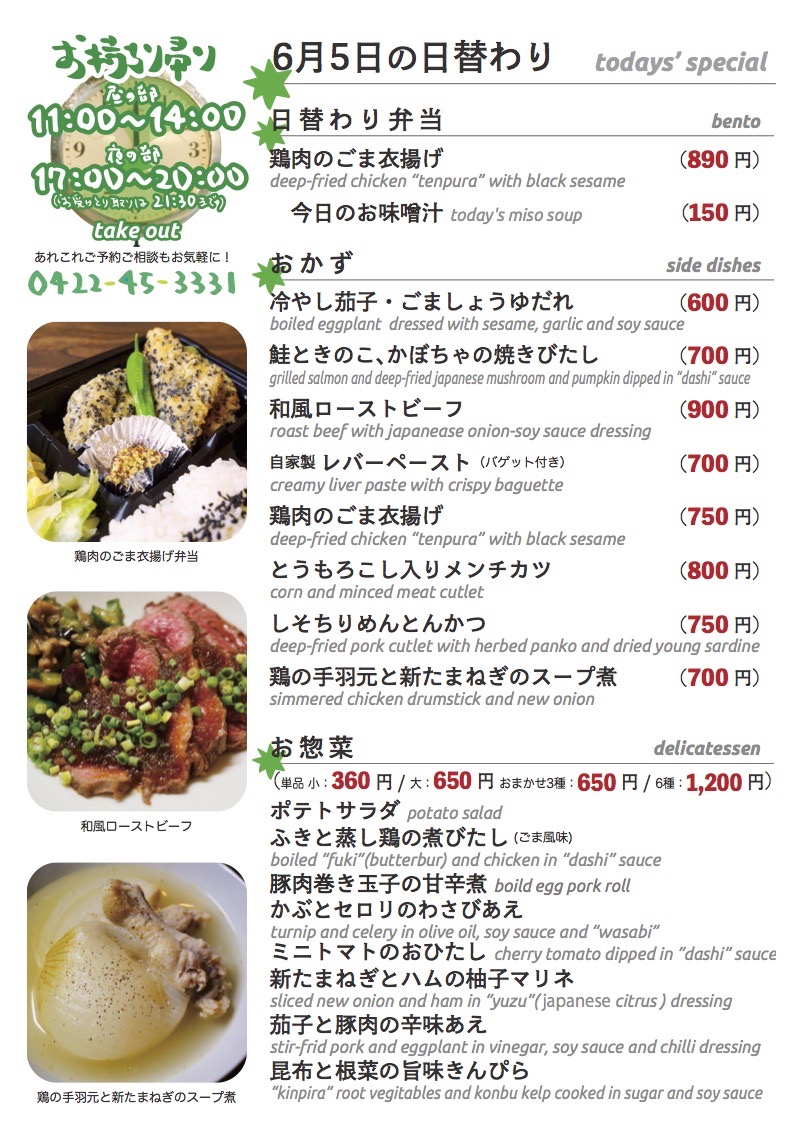 メニューはこちらをクリックしていただければご覧いただけますが...ひとまずはお昼の部のみ、お弁当がそのまま以前のように定食でお召し上がりってなところからスタートとさせていただきます。