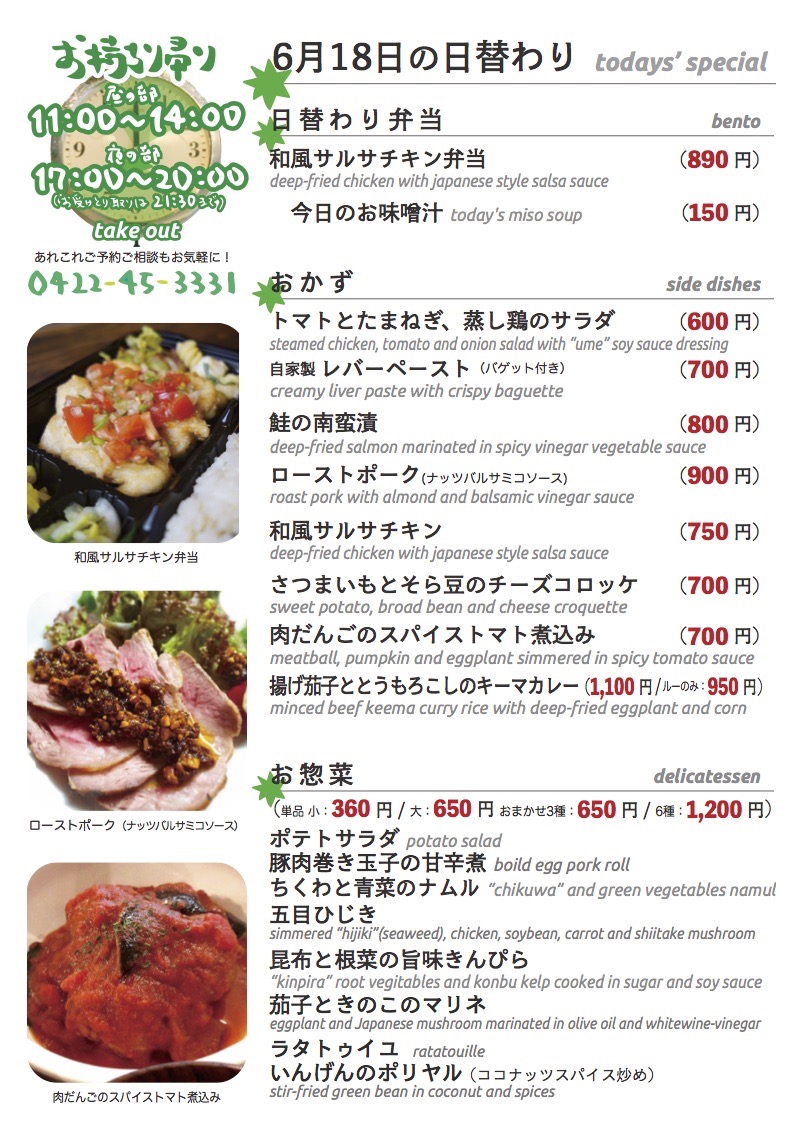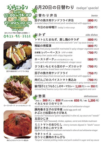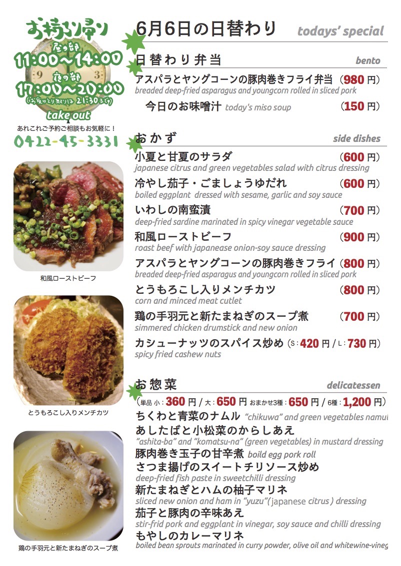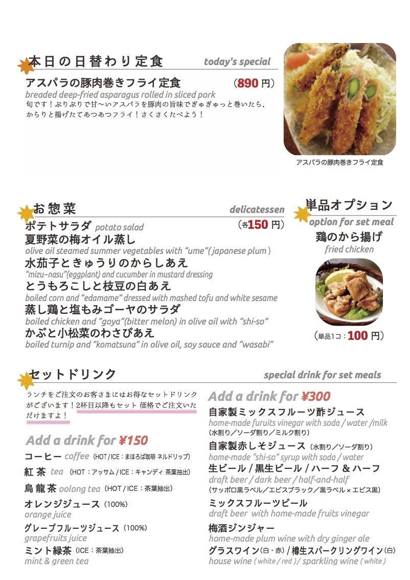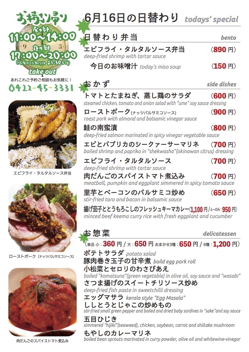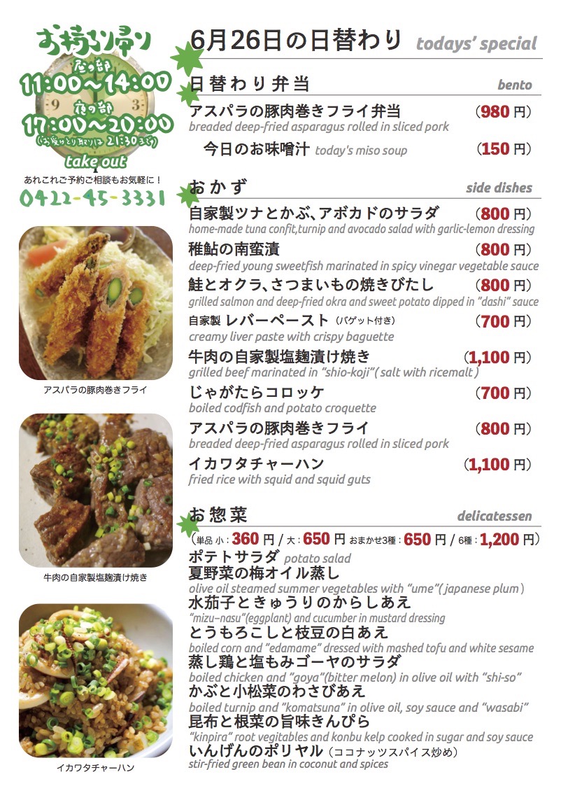 メニューはこちらをクリックしていただければご覧いただけますが...ひとまずはお昼の部のみ、お弁当がそのまま以前のように定食でお召し上がりってなところからスタートとさせていただきます。