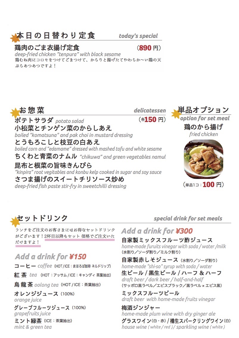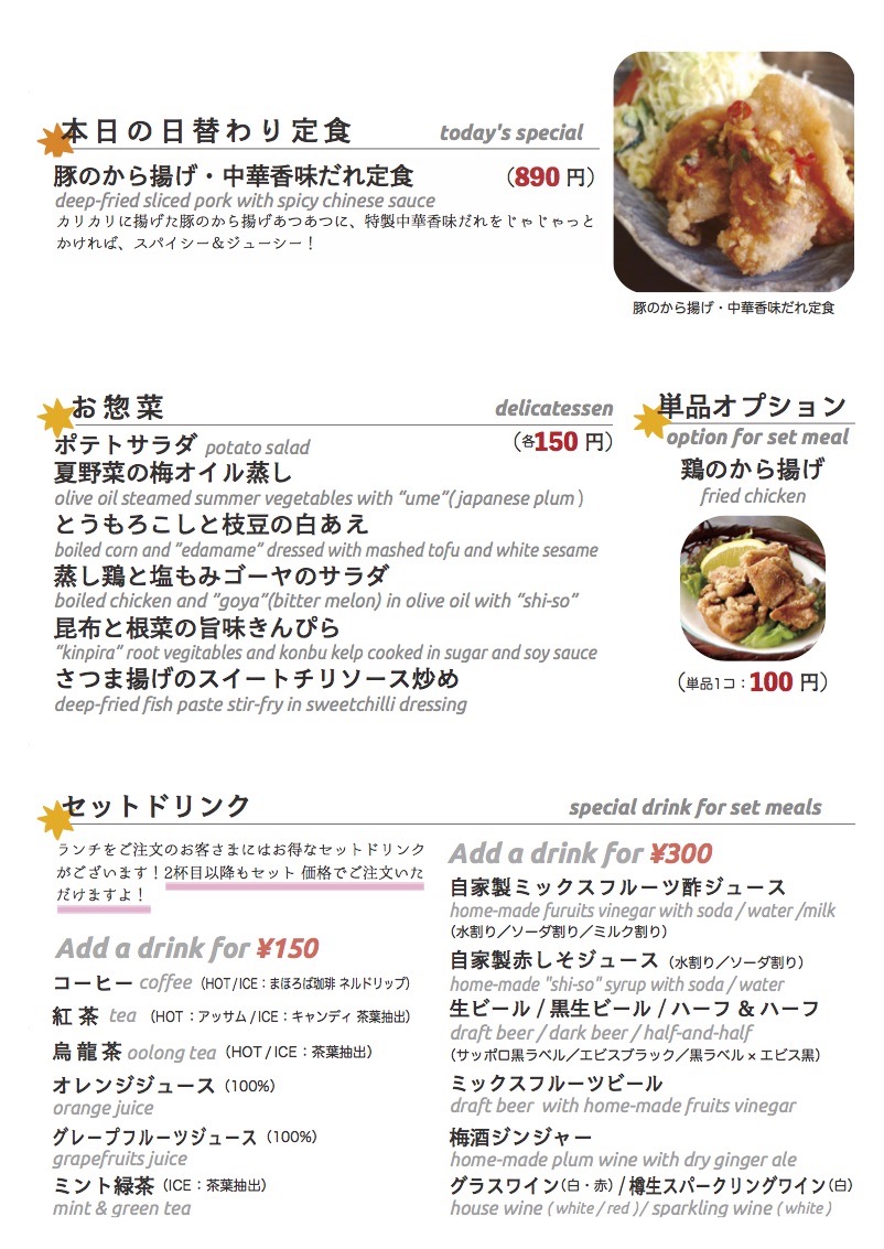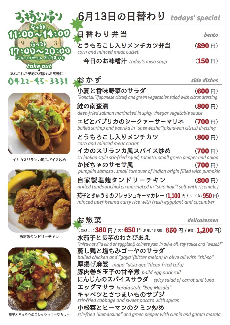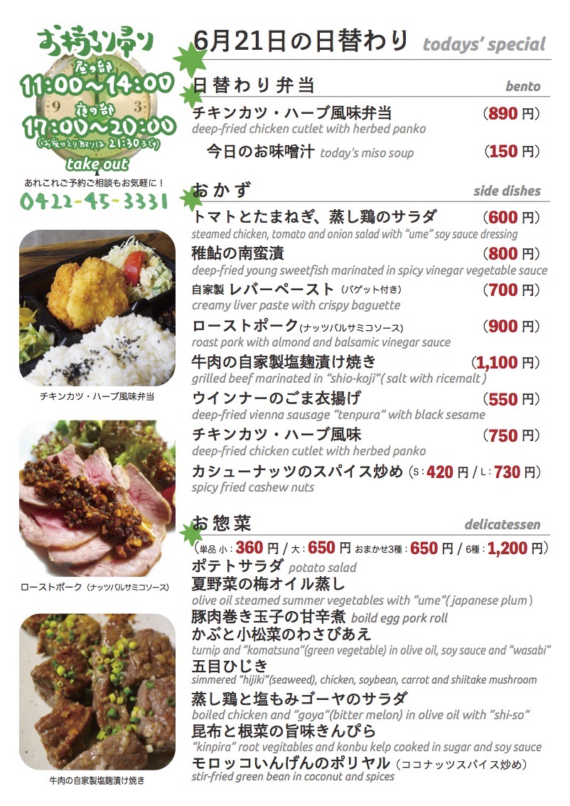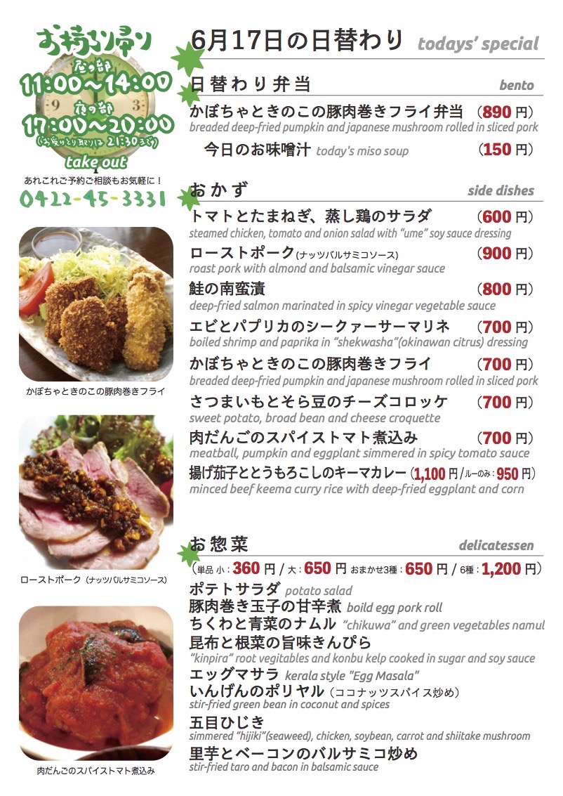 メニューはこちらをクリックしていただければご覧いただけますが...ひとまずはお昼の部のみ、お弁当がそのまま以前のように定食でお召し上がりってなところからスタートとさせていただきます。