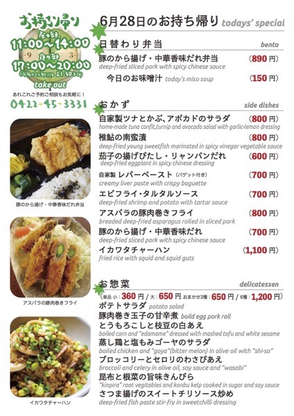 さてと東京三鷹は今日もすかっと夏日和!ワタクシドモオーナー夫婦は朝の徒歩通勤、みなさんの通勤通学時間とぶつかるので道もわいわい賑やか...4月にお持ち帰り専門店として再スタートは出勤も2時間早まってと、その頃に比べたらホントに人出が多くなったなぁなんてコトを思ったりします、えぇ、あれから2ヶ月で6月ですものね。