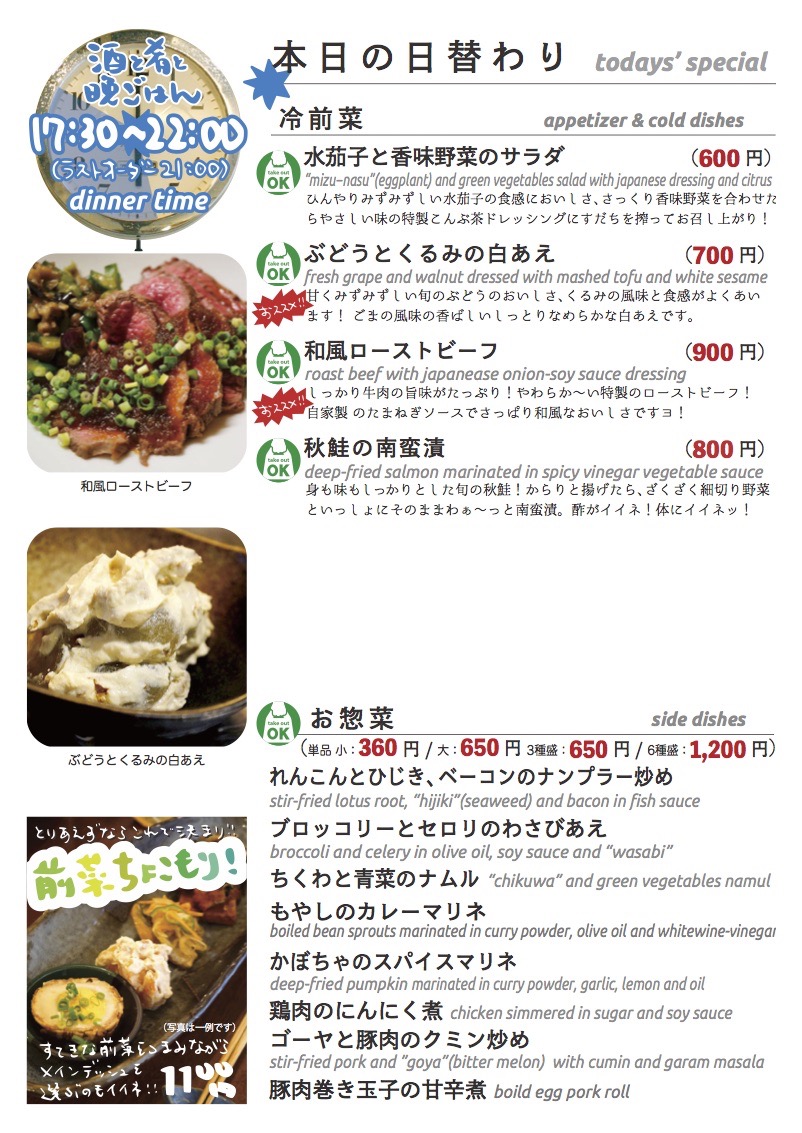 今夜もおいしいごはんは日替わりに、もちろんお持ち帰りも!