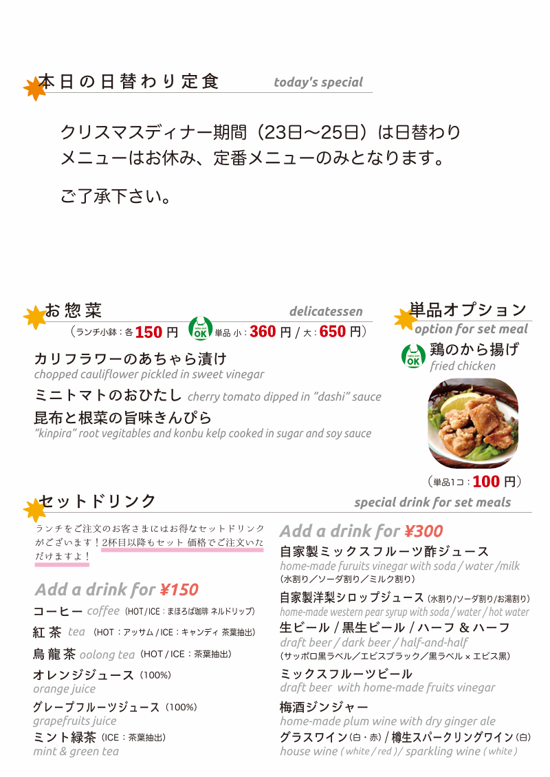 さてと当店今年最後の連休明け!夜は毎年恒例クリスマスディナーで年末までぶっ続け営業は通称「死のロード」スタート!(苦笑)...と、さらに【重要】クリスマス期間中の営業についてあれこれお知らせもしつつ...今日のお昼ごはんにお持ち帰り日替わりですよ。