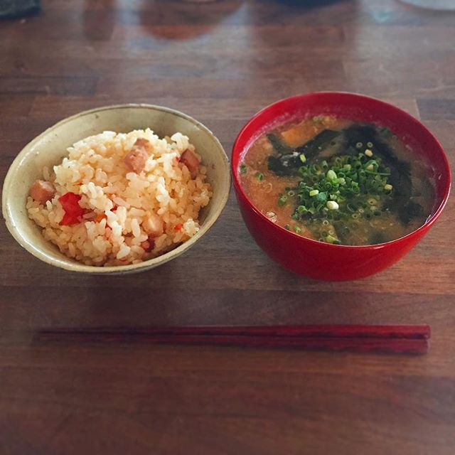 トマトとベーコンの炊き込みごはん。宴会の残り物を冷凍しておくと、豪華な朝ごはんになって良いなあ。卵とわかめを入れたお味噌汁がおかず。