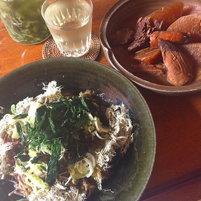 乾麺の十割蕎麦が美味しいー。またまた乾燥海藻が大活躍。ふのり、あおさ、とろろ昆布。今回はネギもたっぷり、お店の残り物のブリ大根。お家の大掃除をさらにやって、夜はご馳走を食べに行くのだーー!!
