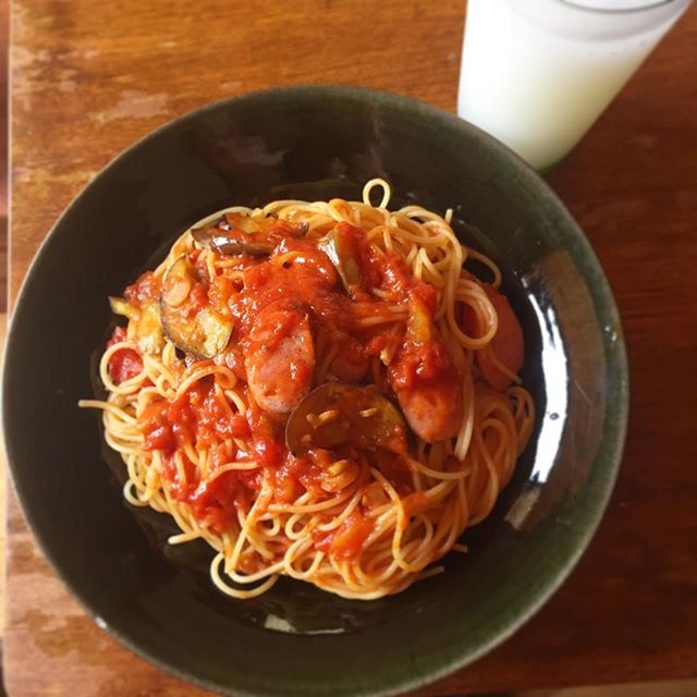 2019年8月15日2019年8月16日 シミシエッダが連休で行けないショック!! 数ヶ月食べられてない、穴埋めの自作トマトパスタ。ナスとウインナー。トマトソースは先日ラタトゥイユを作った時に多めに作っておいたもの。ま、これはこれで美味しいんですが。
