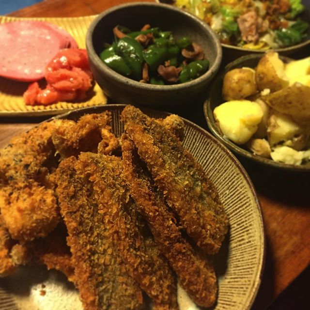 2017年6月26日2017年9月5日 突然食べたくなって、アジフライときのこフライ。家で揚げ物するのは、めんどくさい気持ちと食べたい気持ちの戦い。新じゃが蒸して砂肝とピーマン炒めて、レタスと豚肉の酢蒸し作って、今日も作りすぎです。 permalink